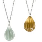Lampion-Anhänger Pampel mit 8 Lamellen, Prasiolith, mit 90 cm Edelstahlkette, 710 Euro. Anhänger Pummel mit Citrin, mit 90 cm Edelstahlkette, 420 Euro.
