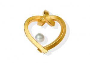 Designerin Martina Tornow tritt mit dem PerlHerz aus der Kollektion Gebundenes Herz an, in Silber goldplattiert mit weißer Süßwasserzuchtperle. Preis 270 Euro.