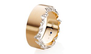 Markus Schmidt schickt den markanten Cliff-Ring in Rotgold 750 mit 29 Brillanten 0,18 ct. tw/vs ins Rennen. Preis 4.090 Euro.