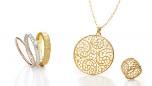 Die Brautschmuckkollektion von Brigitte Adolph lässt regelmäßig Frauenherzen höher schlagen. Zart wie Spitze, in silbrigem Weiß oder sonnigem Gelb und doch ganz und gar aus Silber gefertigt, bezaubern die nach historischen Spitzendekoren gefertigten Schmuckstücke durch Raffinesse und Romantik. Jetzt gibt es zum Brautschmuck auch passende Trauringe – und sogar so gefertigt, dass auch Männer keine Scheu vor ein wenig Spitze zu haben brauchen. Brigitte Adolph wickelt sie eben alle um den Finger… Dekorative Neuheiten gibt es auch in der Goldkollektion. Doch wir wollen nicht zu viel verraten. Lernen Sie den Schmuck der Designerin durch unsere zukünftigen Aussendungen einfach selbst kennen!