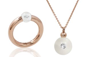 Für eine noch intensivere Ausdruckskraft wird die Kugel auf der Rückseite mit einem farbigen Glaspunkt hinterlegt, wodurch ein schöner Kontrast zum funkelnden Brillant entsteht. In den Schmuckstücken aus Edelstahl wurde dafür meist ein schwarzer Hintergrund gewählt. In der sommerlichen Rotgoldkollektion wird auf den harten Farbkontrast jedoch zugunsten einer femininen und zarten Kombination mit sanftem Milchweiß verzichtet.