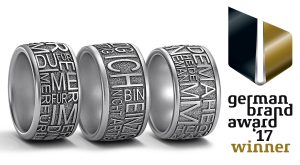 Eine Jury aus Wirtschaft und Wissenschaft prämierte die besten Unternehmen Deutschlands für deren erfolgreiche Markenführung – und zeigte sich beeindruckt von dem Ring „Enigma retro“ aus Edelstahl mit Schriftgravur in 3 D-Optik. Der trendige Ring trägt die „DNA“ der Marke in sich: Hochwertiger Schmuck aus Edelstahl in bester Qualität und mit hohem Anspruch an Design und Optik. Typisch für Heideman und die beiden Firmengründer Eva-Maria und Jan Heideman, die in jüngster Zeit insbesondere mit Gravuren im Schmuck Erfolge feiern konnten.