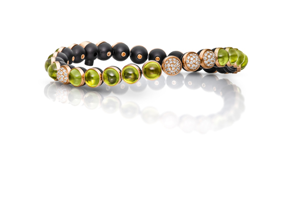 Jörg Kaiser: Rivière-Armband aus 18 Kt. Roségold mit Peridot-Steinen im Cabochon-Schliff und glitzernden Halbkugeln mit Brillantpavé, 9.980 Euro.