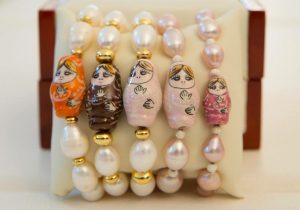 Die Schmuckmarke Célia von Barchewitz hat der Matroschka ein kleines Denkmal gesetzt und kombiniert sie mit feinen Süßwasserzuchtperlen. Statt aus Linden- oder Birkenholz ist das Püppchen aus Porzellan gefertigt und handbemalt. Umringt wird der niedliche Talisman von ovalen Biwa-Perlen, die sich durch einen schönen und gleichmäßigen Lüster und eine glatte Oberfläche auszeichnen.