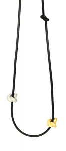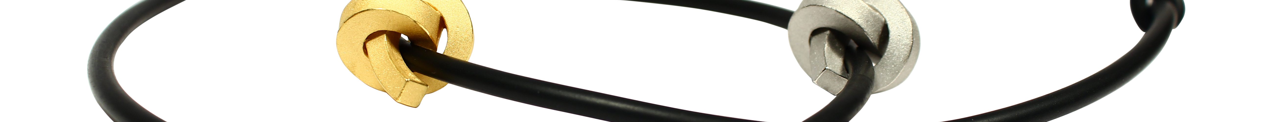 Zwei massive Knoten aus 925er Silber, einmal hell rhodiniert und einmal vergoldet, getragen an einem schlichten Band aus Kautschuk. Ein Schmuckstück für Männer und Frauen, für Freundinnen und Freunde, für du und ich.