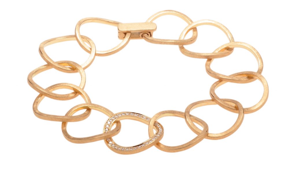 Am Anfang war der Ring: “Saturn“ von schmuckwerk, eine Verschlingung aus verschiedenen unterschiedlichen Ringen, die zu einer überzeugenden Einheit werden. Genauso überzeugend wirkt das neue Armband der Linie, dessen Glieder sich geschmeidig ineinander fügen. Die gebogene Form der einzelnen Ringe irritieren und fesseln zugleich. Ein etwas anderes Design, von lässiger Leichtigkeit und gleichzeitig mit luxuriöser Ausstrahlung. Schließlich funkeln weiße Brillanten in einem der Ringe des „Saturn“. Einfach himmlisch, typisch schmuckwerk.