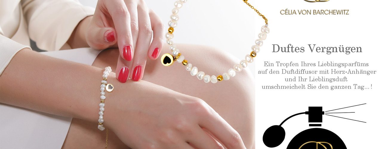 Wie duftet die Liebe? Oft verbindet man mit dem oder der Liebsten einen besonderen Duft, ein After Shave oder Parfum, den Geruch von Zuckerwatte beim Kennenlernen auf dem Jahrmarkt oder von Herbstlaub beim Zusammentreffen im Park. Im Perlenarmband von Célia von Barchewitz kann der Lieblingsduft – sofern es sich um ein Parfum handelt – erneuert und bewahrt werden. Im Herzanhänger verbirgt sich ein Aromastein aus Keramik, der als Diffusor fungiert und mit einem Tropfen des Lieblingsparfums beträufelt werden kann. Der Stein gibt den Duft nach und nach ab und bewahrt ihn für Stunden oder – je nach Intensität – gar für Tage.
