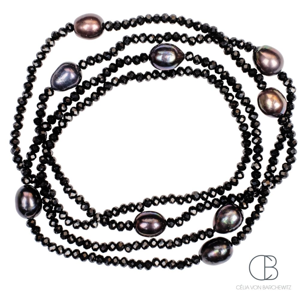 | Kette aus schwarzen Kristallen, mit schwarzen oder weißen Biwa-Süßwasserzuchtperlen | ||