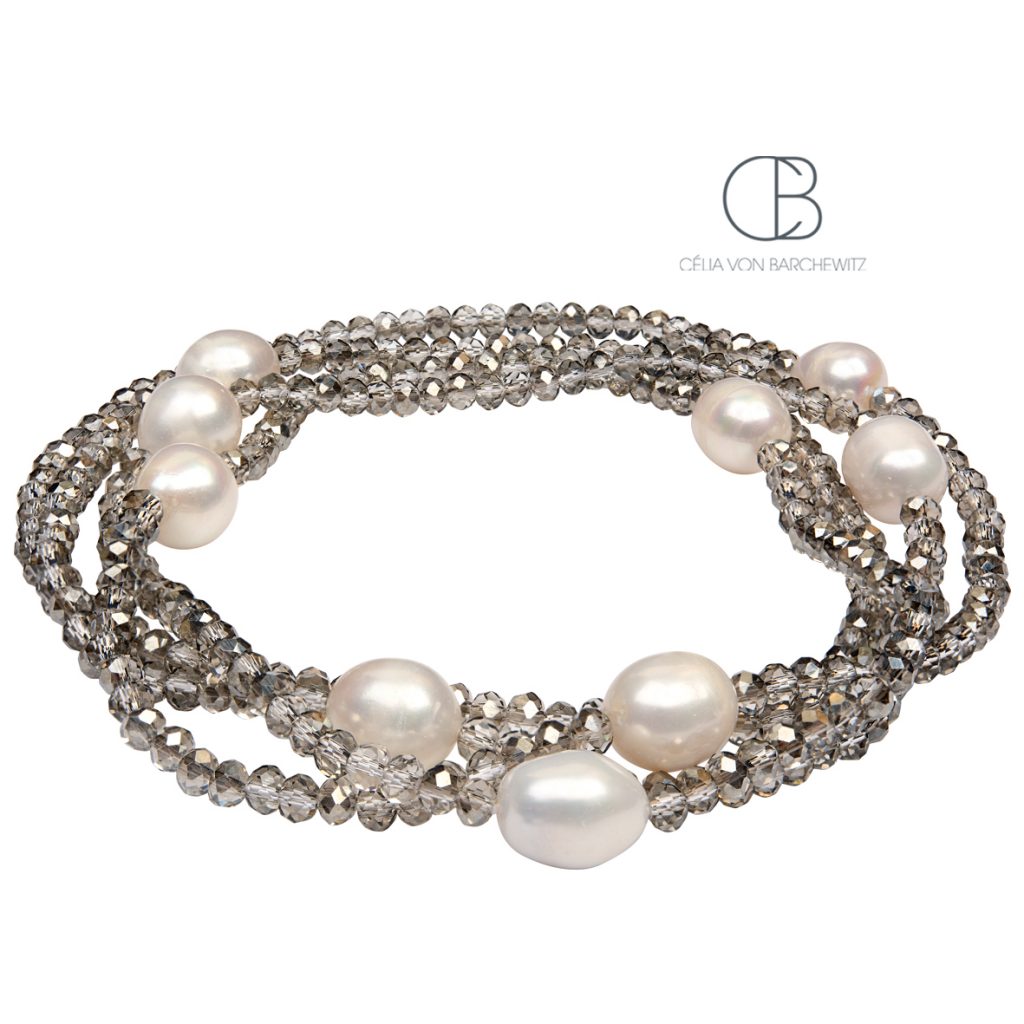 | Kette aus beigefarbenen Kristallen, mit weißen Biwa-Süßwasserzuchtperlen | ||