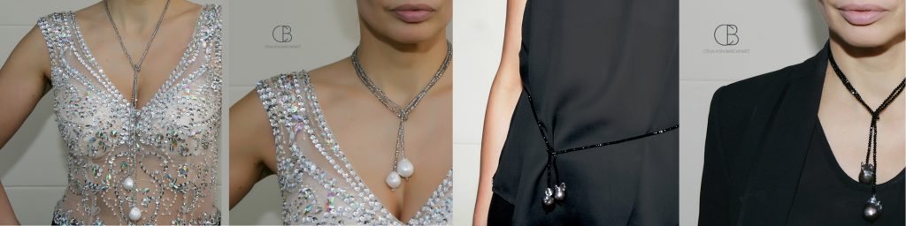 | Kette aus beigefarbenen Kristallen, mit zwei barocken Süßwasserzuchtperlen | Kette aus schwarzen Kristallen, mit zwei barocken Süßwasserzuchtperlen |