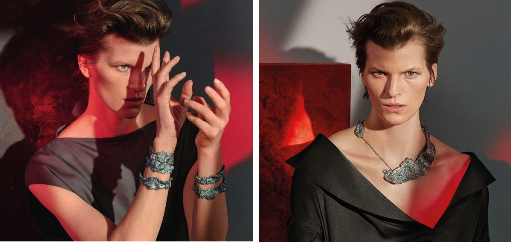 Ungewöhnlich geformter Ohrschmuck, ein extravagantes Collier, verschiedene Kettenvarianten sowie ein kraftvolles Armband prägen die ersten Stücke der neuen Linie. Sie alle sind kreativ miteinander kombinierbar Mit der Integration der Lapponia Signature Chain wird dem legendären Lapponia-Designer Björn Weckström Reminiszenz erwiesen.